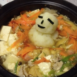 スープ、具材を全て入れて、火にかける前の鍋に、みぞれ雪だるまをのせます。