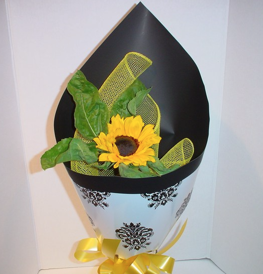 黒でお花を包むと、日本人にはではどうしてもお葬式のようなイメージにも見えてしまいがちですが、ヒマワリなどの主張が強く明るい色のお花は、濃い色で包むとお花が映えます。黒でなくても、濃いブルーやお花と反対色の色合いの濃い目の画用紙を選んで、リボンはお花の色に合わせると素敵です。