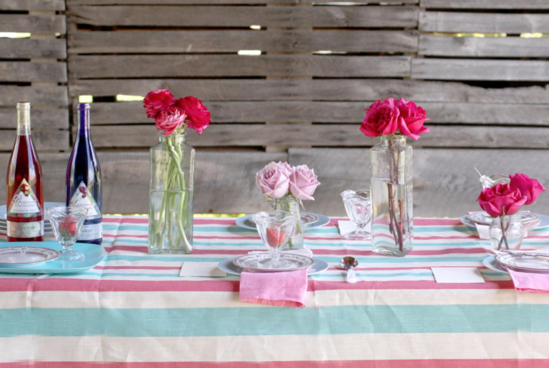 ピクニックテーブルにテーブルクロスをしくことで、清潔感と華やかさを演出できます。テーブルにアレンジするお花の色は、テーブルクロスの色や同系色のものを選ぶと統一感があって素敵です。