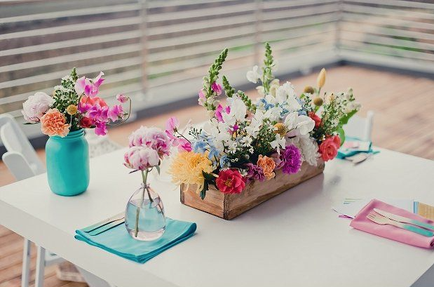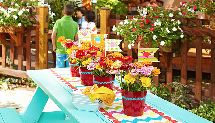 カラフルなテーブルランナーの上にカラフルなフラワーアレンジをたくさん並べる。フラワーアレンジに旗を立てて、子供ガーデンパーティーテーブルの完成です。