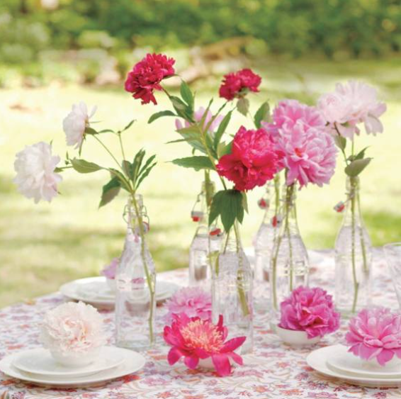 豪華なフラワーアレンジは必要ありません。空き瓶に1〜2本お花を挿して、いくつかセンターに並べるだけで豪華です。