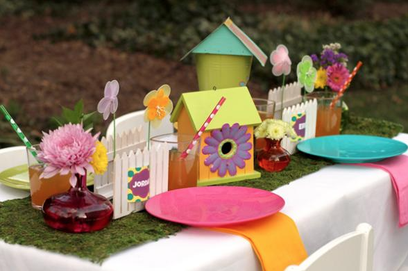 パーティーテーブルにはテーブルクロスをしいて、カラフルなプレスティックプレートやビビット色の紙コップをセットすればOK。