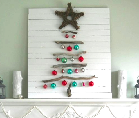 小枝は壁ツリーの材料に大活躍!こちらは、小さなスペースに立てかけて飾るツリー飾りのアイデアです。