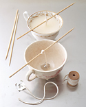 いい長さで芯を切ります。 - 溶けたロウをティーカップに注ぎいれます。