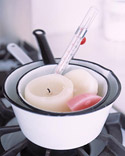 - 大き目の鍋に水を入れて沸騰させ、小さい鍋を中に入れて、その中でロウを溶かす。