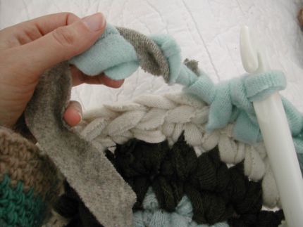 帯を通してカギ編みすると、サイドが編めてきます。 - 好みの高さまで編めたら、最後の部分をブレンドさせて