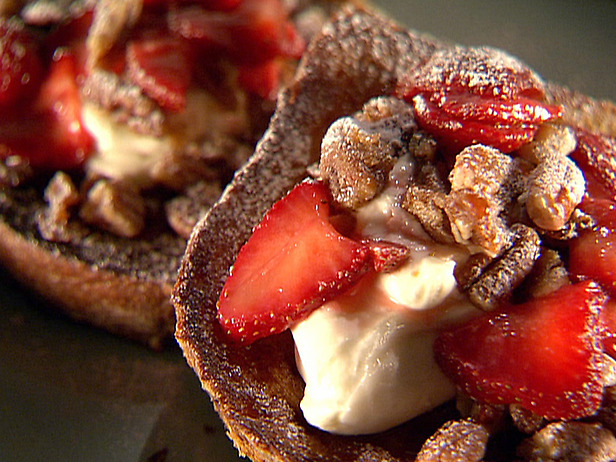 シュガーが溶けて、ピーカンにからむまで火にかける。 - お皿にフレンチトーストを盛り、クリーム、ストロベリー、ピーカンをのせる。