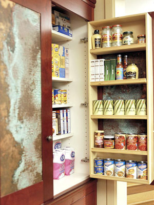 キャビネットドアの裏に、囲いのある薄い棚に補強して取り付ければ、収納を上手に