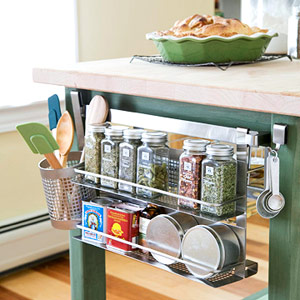 お風呂場で使うような、2,3段の小さなステンレス棚を、カウンターのサイドなどに取り付けて、