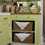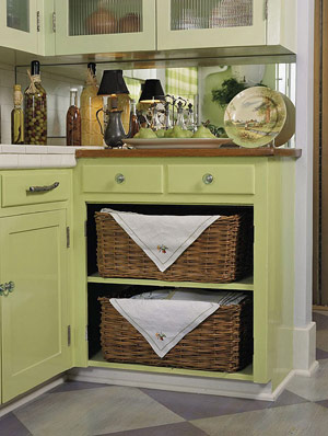 使いにくいキャビネットは、ドアを取り外してバスケット収納にしても味がでて素敵です。(写真真ん中)