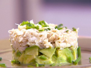 - アボカドの上にカニをのせ、小ネギを刻んで散りばめる。