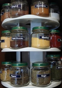 様々な形の容器で購入したスパイスも、同じ瓶に入れ替えてラベルをつけて並べれば