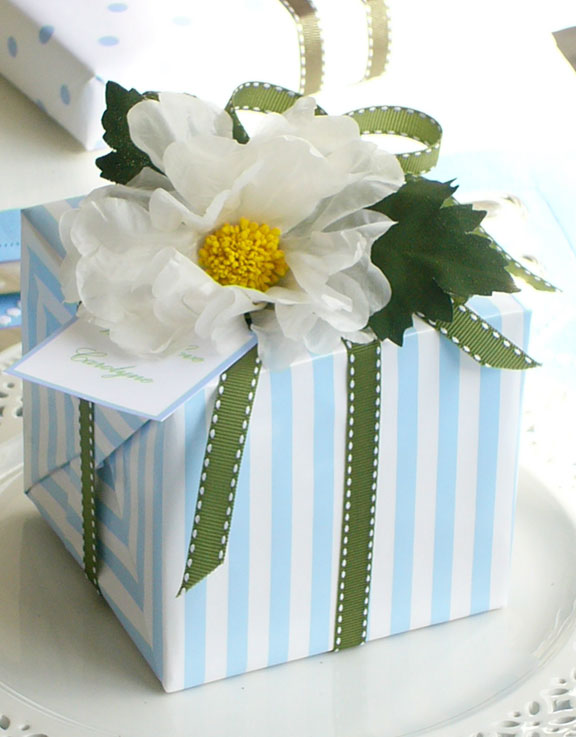 ラッピングしたギフトボックスに、リボンボウではなくて、お花のモチーフをあしらっています。造花やモチーフをリボン変わりに使うのも、目立って素敵ですね。