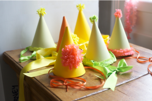 ポップな柄の画用紙でパーティーハットを作れば、沢山の飾り付けをしなくても、目を引く素敵なデザインに仕上がります。