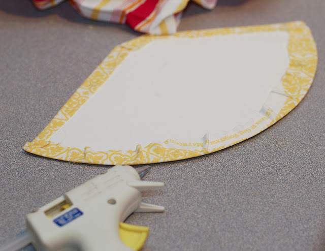 厚紙の裏側に余った部分の生地を回し、ホットグルーガンで貼る