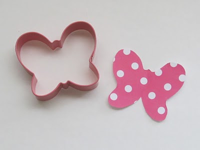 ピンクに白いドット柄の厚紙に、大きめの蝶々や大きめのリボン型を下書きして、カットする