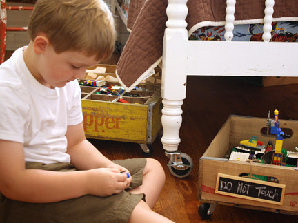 ワインをケース買いした時の木箱は、必ずキープ!使い道がいっぱいあります。ヤスリをかけてキャスターをつけて、そのまま子供部屋の家具下の隙間へ。