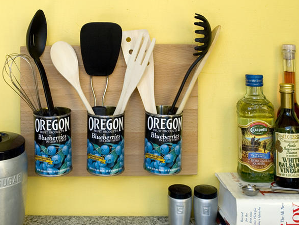 空き缶を板に取り付けるだけ、壁に取り付ければ、場所を取らない収納場所のできあがりです。カウンター上の壁に空いているスペースがあれば、こんなアイディアもいいですね。空き缶も上手にリサイクル利用できて、エコ収納。