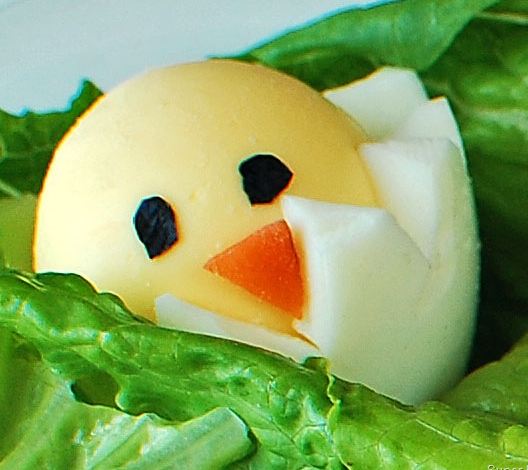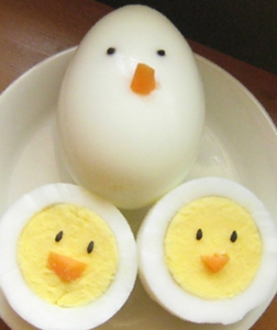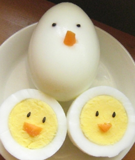 丸ごとゆで卵でお母さんニワトリ、半分にカットした玉子でひよこをデザイン