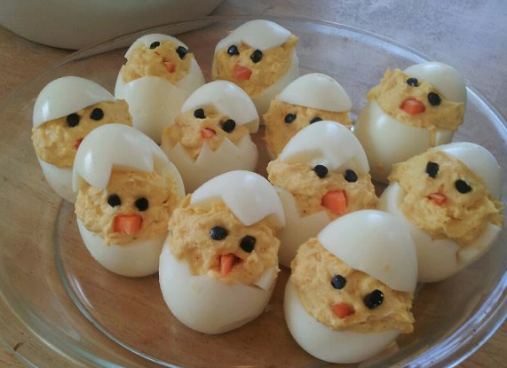 卵を割って、中の黄身でヒナドリを表現、とてもかわいいイースターエッグアイディアです。