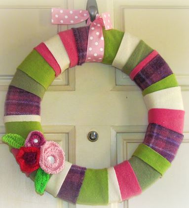 フエルト生地を巻いて作る、優しくてあったかい感じのするウエルカムなリースです。