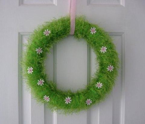 チェーンにかぎ編みした毛糸を巻いてお花を作り、リースに飾り付けます。