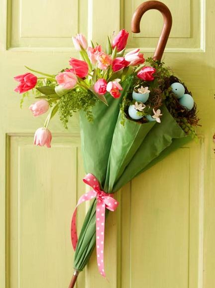 傘のヒダの1つに口の広いペットボトルを入れて、中に少し水を入れ、フラワーアレンジメントします。(傘からお花が飛び出すように)