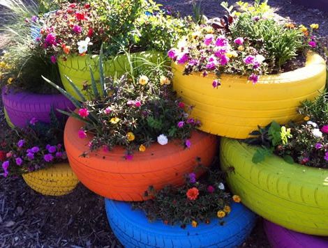 カラフルなタイヤに植えられたお花の花壇は、アイディアが楽しく、お庭を明るく飾れて素敵です。