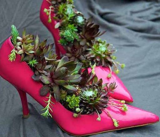 これまでに、靴のリサイクルで使われたプランターを色々と見て来ましたが、パンプスの植木は初めて見ました。
