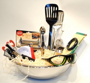 バスケットの代わりにボウルやおしゃれなデザインのざるを使えば、それごと使えて便利。ボウルにパッキンを詰めて、キッチンツールを詰め、ボウルにリボンをかければおしゃれなギフト。