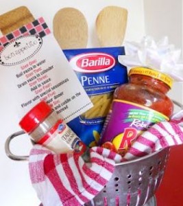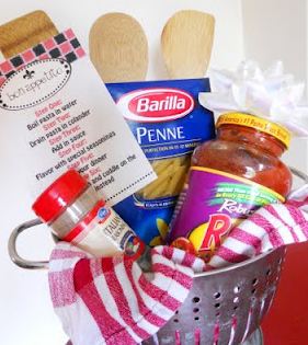 これで1回分美味しいパスタが作れる、その料理の具材とツールを全て詰めた食べ物バスケットです。例えば、美味しいパスタのレシピを添えて、そのお料理に必要な材料と、料理の際に使うちょっとしたキッチンツールをそえて、おしゃれなザルにキッチンタオルをのせて詰める。どこかにリボンをつければ、素敵なギフトに。