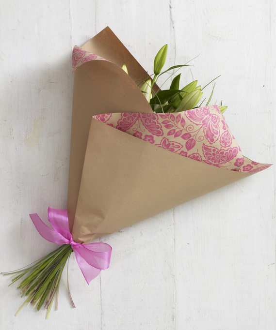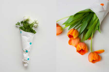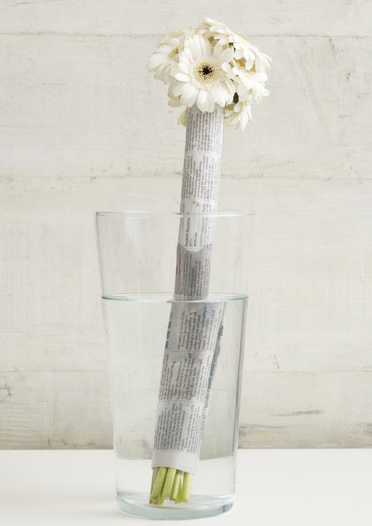 数本の小さな葉の無い花束に便利。ただ新聞紙を真っすぐ横に、きつめに巻き付けるだけ。リボンなどで飾らない、素朴な感じも素敵。