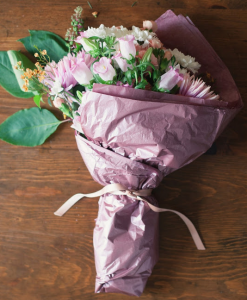 ラッピング用のティッシューペーパーを何枚も重ねて、柔らかい感じにふわっと包む、優しいお花の包み方です。