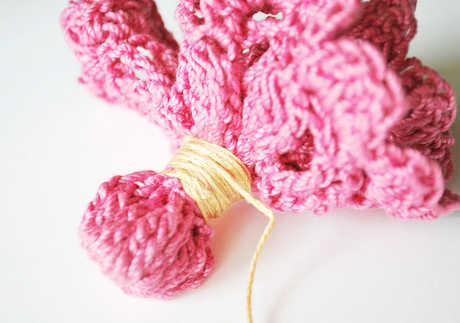 短めで小さい花束にはこれ!カギ網されたクロシェの鍋敷き、小さい花束の下に包み込む。あったかい感じが素敵、便利に使えるラッピング方法です。素朴な草花なんかのラッピングに映えます。