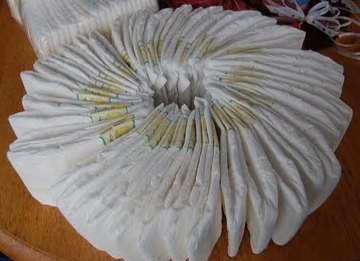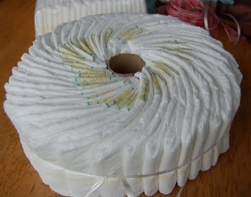 トイレットペーパーの芯や、サランラップの芯を中心に入れて、その周りにオムツを渦巻きのように並べる