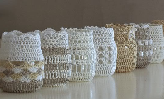 小さなジャムの空き瓶に、かぎ編みしたスリーブを着せています。