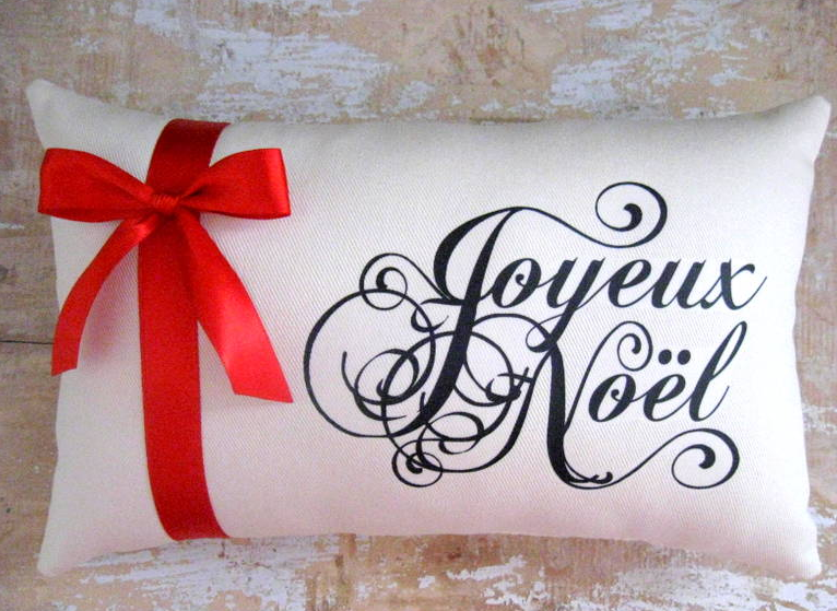 クリスマスプレゼントのような、赤いリボンが目立つ素敵なクッションデザインです。