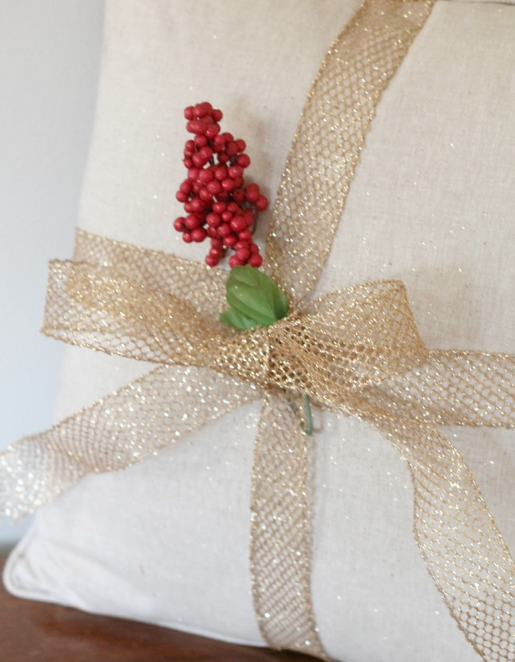 お手持ちのクッションに、ゴージャスなリボンをギフトラッピングのリボンのようにかけて、結ぶだけです。