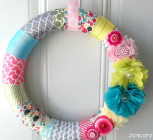 いろいろな絵柄のリボンを巻いた、カラフルで明るい春らしいリースです。