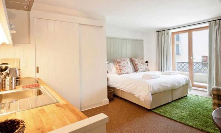 手前にある大きなベッドも、白いファブリックを選べば、色柄のある奥のリビングスペースの方に目がいきます。フォーカルポイントになるリビングに重点を置いて素敵にデコレーションします。