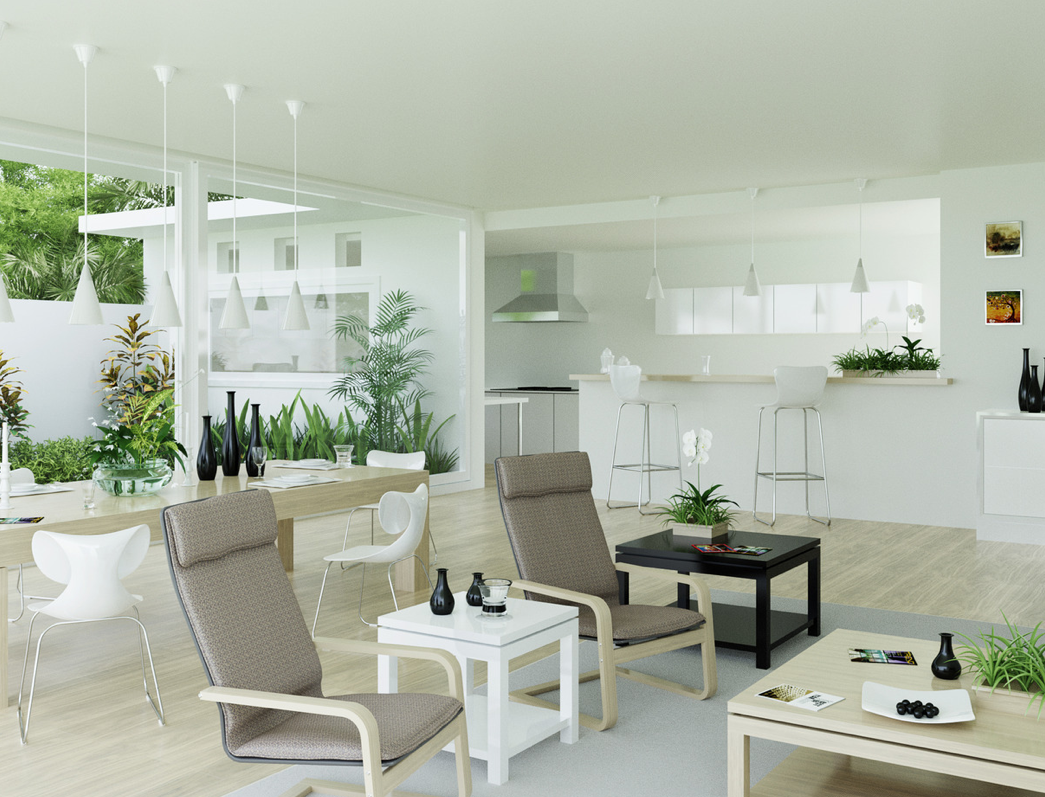 白壁と白い家具、白系のフローリングとトーンを合わせた木製家具で統一された空間は、写真の中のアートのよう。小さな黒い小物も目を引くデコレーションに。
