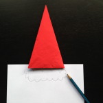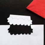 ・顔をハサミで切り抜きます。赤い帽子部分はナプキンで表現したいので、帽子は赤いトップ部分を1cmほどを残して、残りの部分は切り落とします。