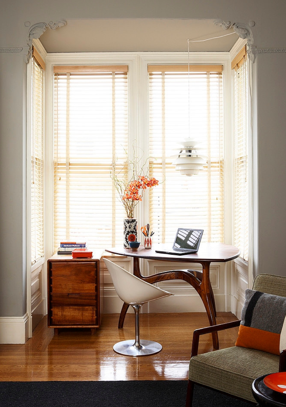棚付きの背の高いデスクと背もたれの高いPCチェアのセットは窓際に配置できなくても、小さなコーナーに収まるデザインの机とチェアのセットならこんなにおしゃれに収まります。