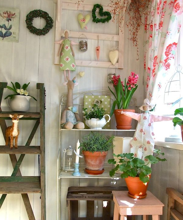 沢山のグリーンとカントリーな小物使いでかわいらしく飾り、花柄カーテンで春を呼び込んでいます。